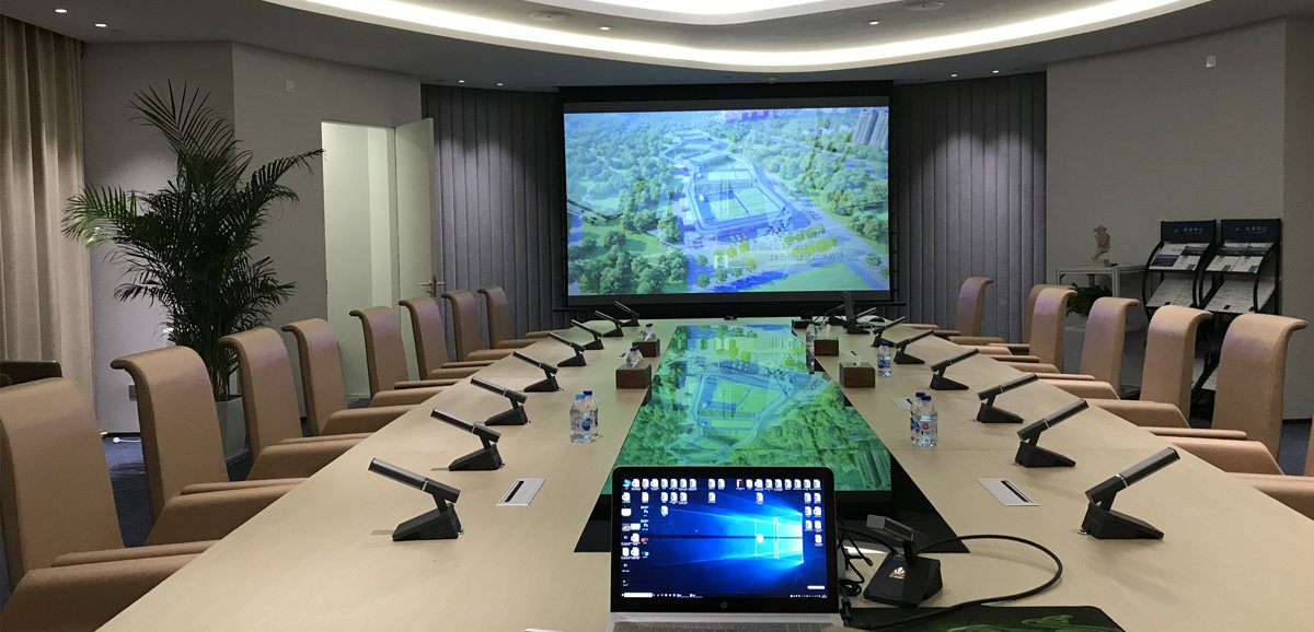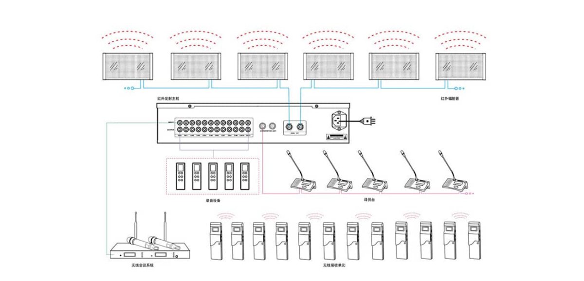 整个红外无线会议系统采用红外无线会议主机、红外无线会议话筒(主席单元+代表单元)、红外无线接收器、红外无线话筒充电箱组成,再搭配音频扩声系统与LED全彩显示屏,就组成了一套常规的红外无线会议室,可满足日常会议需求,同时具备高度保密,以部署扩展,维护方便等特点。