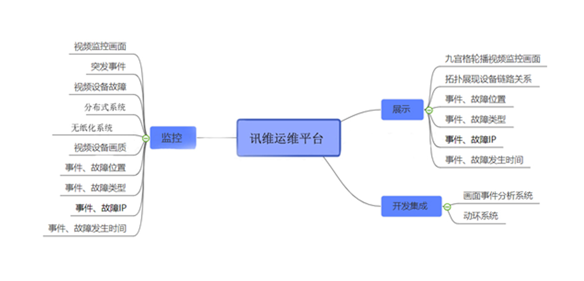 讯维运维平台通过与客户原有的视频画面分析管理系统、动环系统集成,实现视频监控系统综合运维管理,可对突发事件进行预警、告警;对机房环境、设备故障进行监控管理,故障告警;告警信息会通过短信、微信、邮件、系统提示等多种方式及时传达给相应的管理人员。保障视频设备稳定运行及高效维护,保障视频监控业务可靠连续和高质量运行。