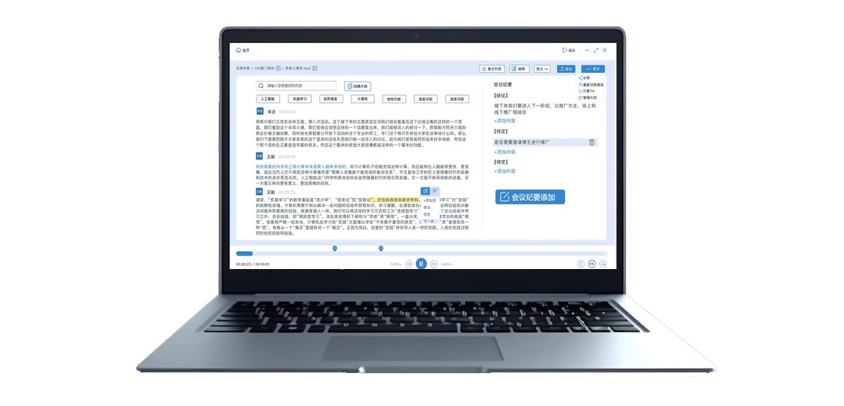 3.智能整理与归档:系统具备智能整理功能,能够自动将转写后的文字按照会议主题、发言人等信息进行分类和归档。同时,支持将会议记录导出为多种格式的文档文件,便于后续编辑和分享。