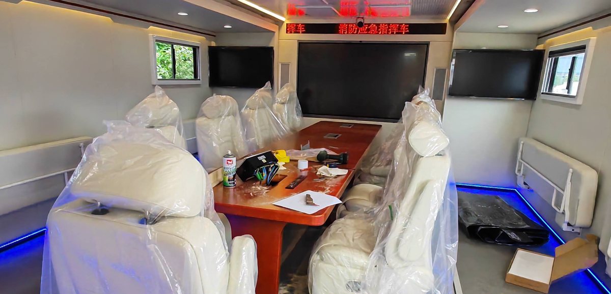 1、应急指挥车:采用一汽底盘,集成了通信、图像、监视、存储、广播、照明、自供电、办公自动化等多种功能。