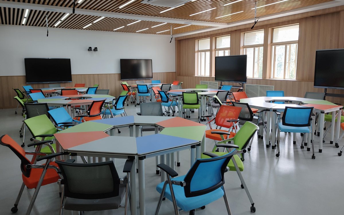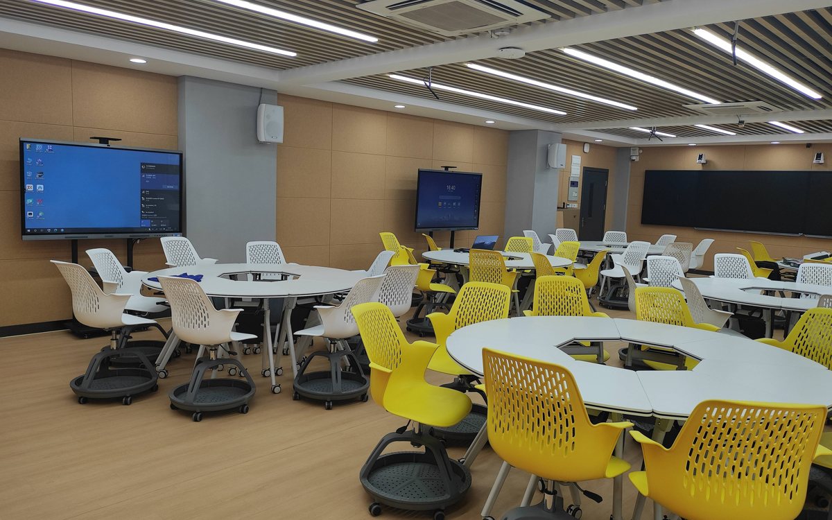 南华大学智慧教室采用圆形桌布局,便于进行小组协作/课题探究,小组侧屏为主,三端协作,便于师生,学生之间的交流与沟通,适用于小组协作教学,探究性教学。学生在教师指导下,通过以"自主、探究、合作"为特征的学习方式对当前教学内容中的主要知识点进行自主学习、深入探究并进行小组合作交流。