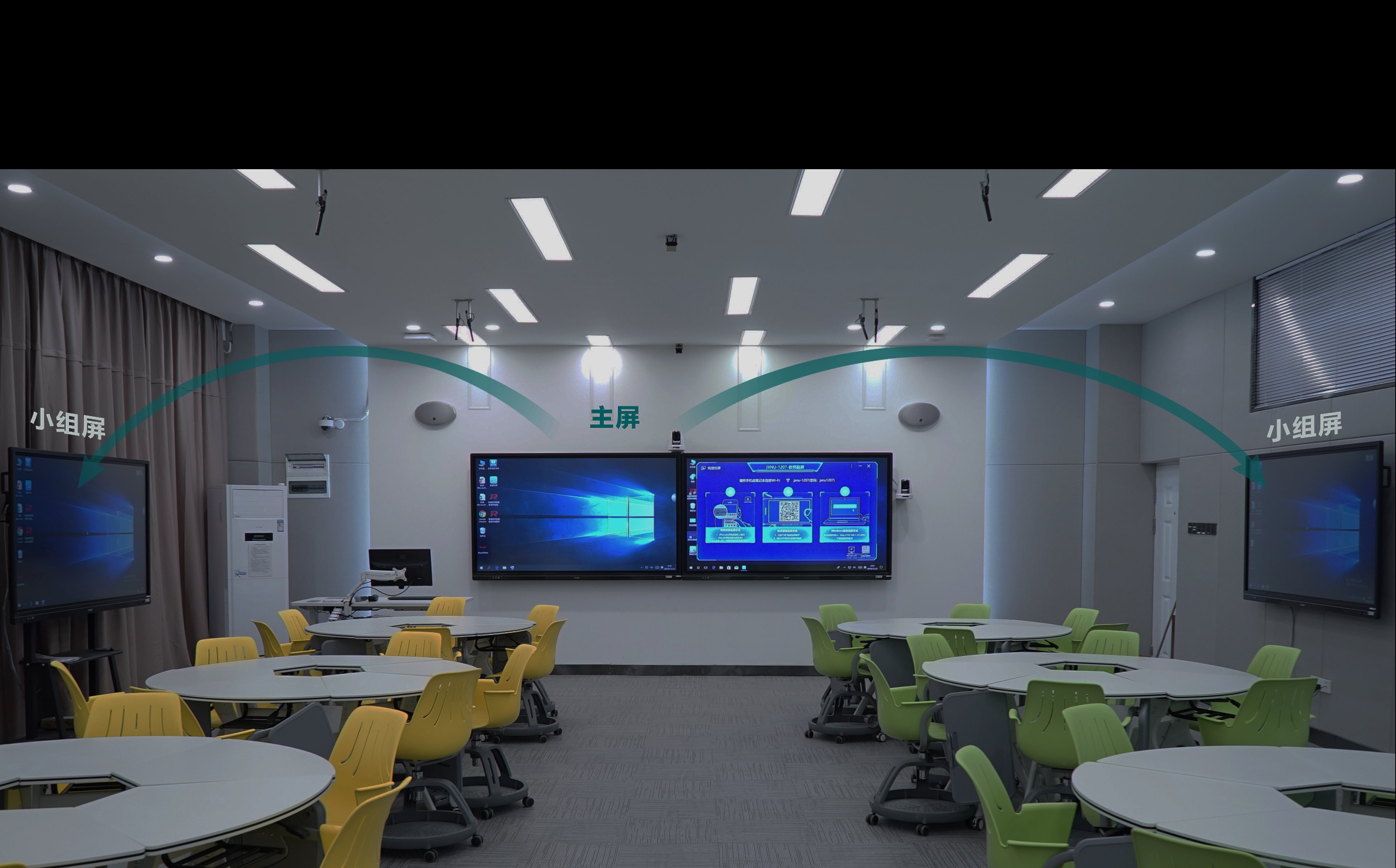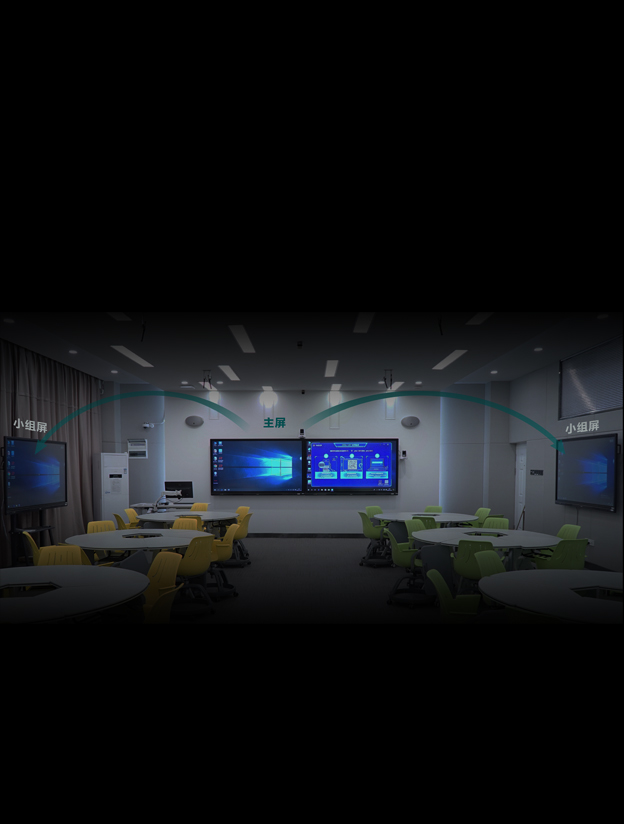 互动显示功能可以将老师主屏画面一键广播到小组屏进行同屏显示,也可以将小组屏画面拖拽至教室主屏展示或分发,便于授课老师进行课件分享、转阅和课件对比评审。