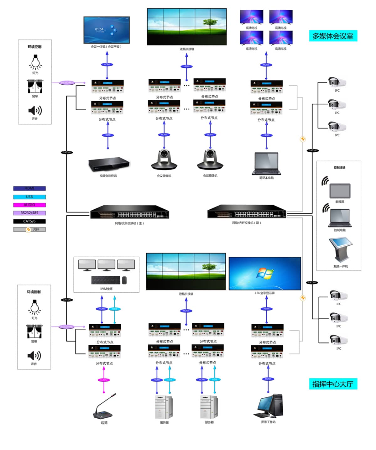 系统可通过一根网线传输音频、视频、控制等多种信号,系统的先进性绝对是音视频行业的佼佼者。多间会议室管理传输只需通过一根楼宇网线或光纤即相互通讯,高清音视频统一传输与管理。