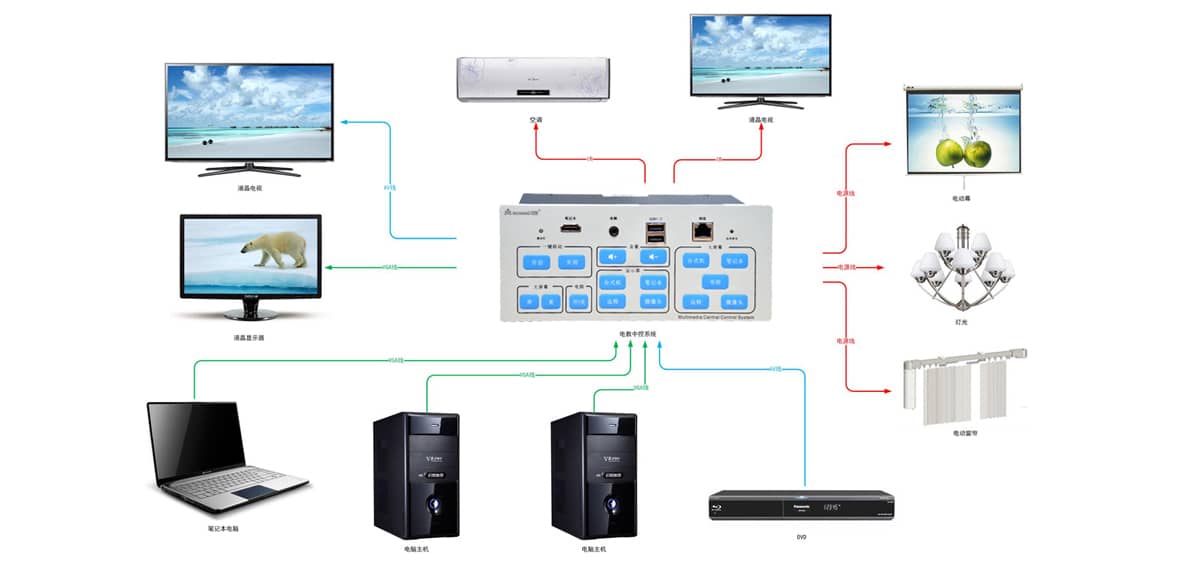 2.以数字式中央控制器作为切换操作台,真正意义实现——便捷、简单、智能、一键切换。教师不需其他复杂操作便能进行教学、演示。