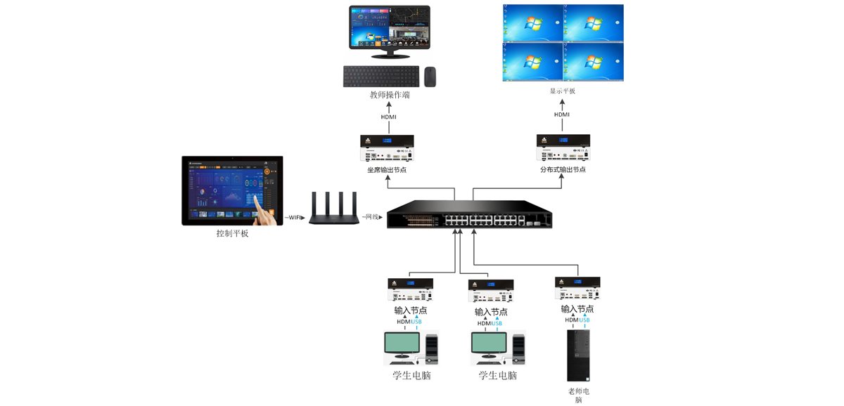 基于以上的需求我们采用了以讯维分布式坐席管理系统来实现对学生和老师电脑视频信号的采集,学生加老师电脑合计29台,我们需要配置29台KVM坐席输入节点,老师可以任意控制切换学生的电脑画面。我们配置了1台KVM坐席输出节点,老师通过此点就可以实现前面功能。配置1台分布式输出节点对接LED显示屏,显示29台电脑的画面上LED屏显示。