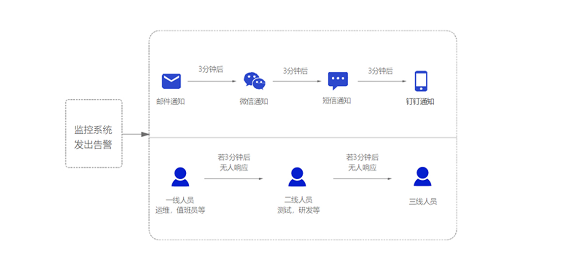 事前:灵活的告警通知,第一时间掌握故障信息;短信、邮箱、电话、微信、钉钉、群聊、机器人等通知方式;告警响应机制+故障升级机制,告警无遗漏;移动运维,第一时间掌握故障信息。