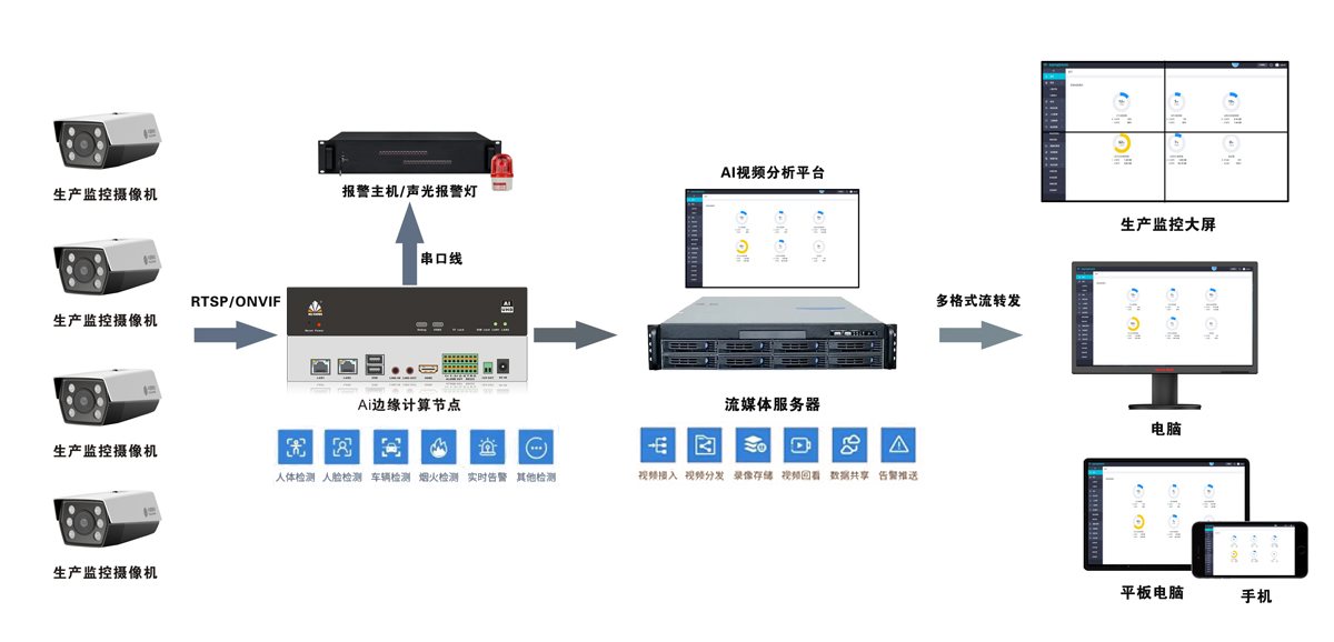 AI智能分析平台由AI边缘计算盒子和AI智能分析软件平台组成,在工业中的应用非常广泛,如钢铁、机械、造船、纺织、食品、家具、电子信息、生物医药、新材料、航空航天、交通运输设备行业的生产制造管理。它极大地提升了生产过程的自动化、智能化水平,提高了产品质量和生产效率。
