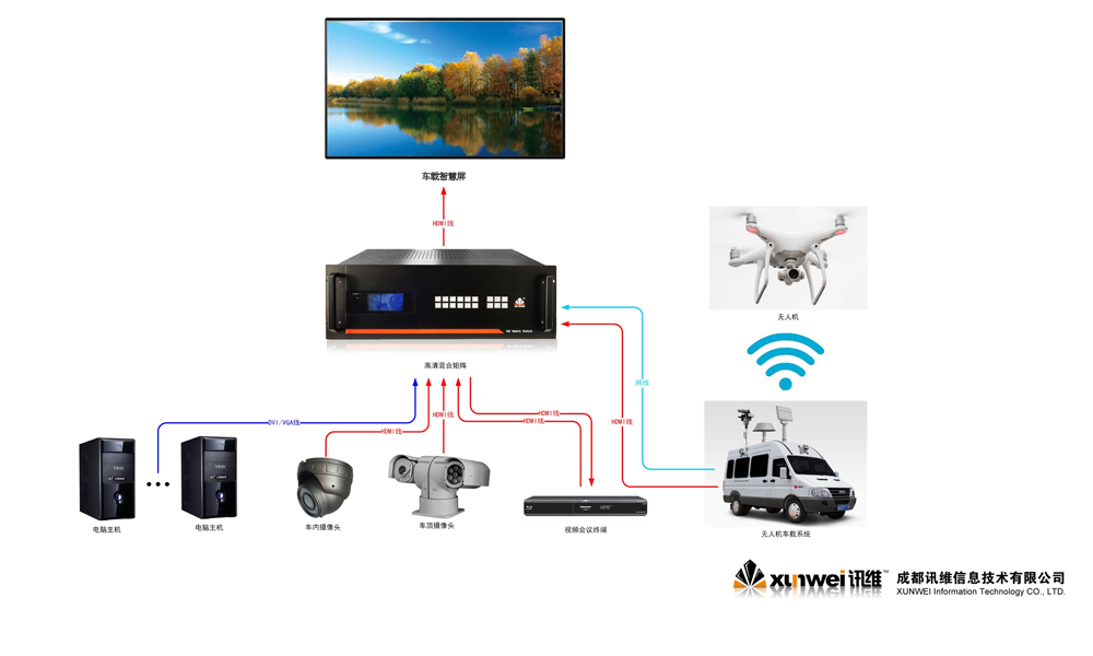4、系统集成与协同:指挥车载系统还集成了智能供配电系统、无线移动网高清音视频通讯系统、微波通讯、图像采集及传输系统等多个功能模块。讯维高清混合矩阵作为信号处理的核心设备,与这些功能模块实现无缝对接和协同工作,确保信息的实时传输和高效处理。