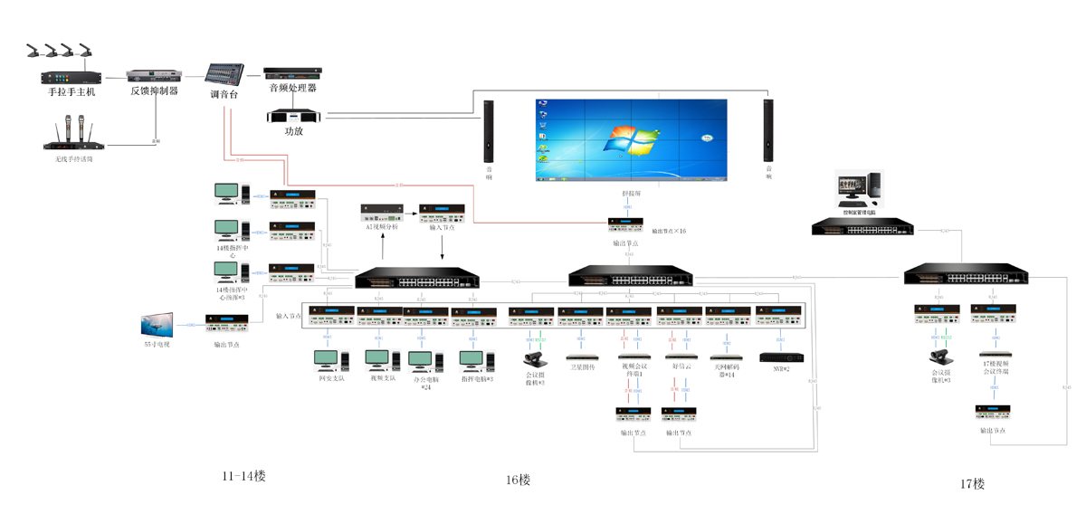 采用分布式可视化系统对接指挥中心的各类音视频硬件设备,完成指挥中心音视频系统中的四大工作:控制、传输、处理、管理。