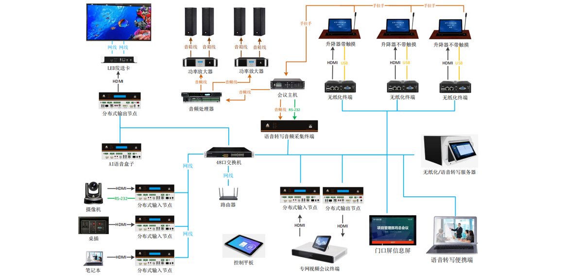 本方案基于人工智能、物联网及数字化技术,构建集语音转写、无纸化会议、中央控制、智能扩声于一体的智慧化会议场景,旨在提升会议效率、降低成本、优化参会体验,适用于企业总部、政府机构、大型会议室等场景。该方案主要包含以下功能模块: